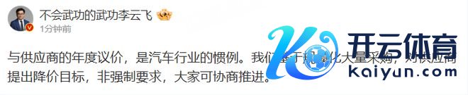 对此,比亚迪集团品牌及公关处总司理李云飞在其微博上发文称:“与供应商的年度议价,是汽车行业的常规。咱们基于限制化多半采购,对供应商建议降价观点,非强制条款,宇宙可协商鼓舞。”