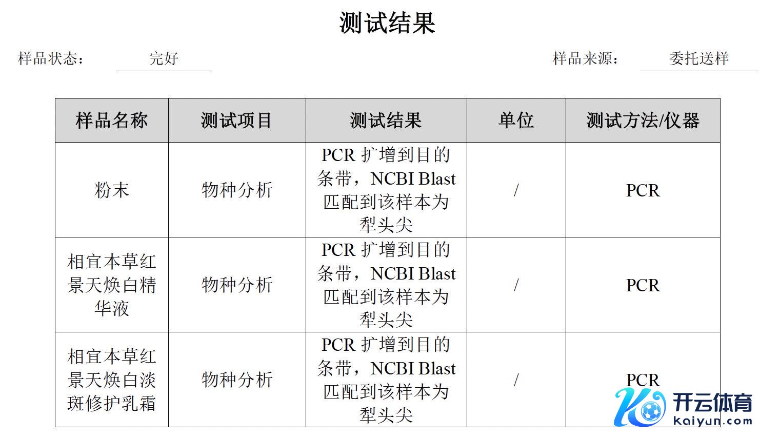 在将相宜本草的相关居品送检专科机构检测后证实,其居品内的确含有“犁头尖”因素基因片断。据了解,相宜本草公司并未将“犁头尖”用于旗下居品的行动在药监局注册或备案,也未信得过将该因素露馅在其因素表内。上述“吹哨东谈主”称:“为了笼罩该有毒原料的使用,相宜本草先后通过请托多家不同公司,去云南等地完成采购、物资提真金不怕火、期间加工、出产制造等武艺。“