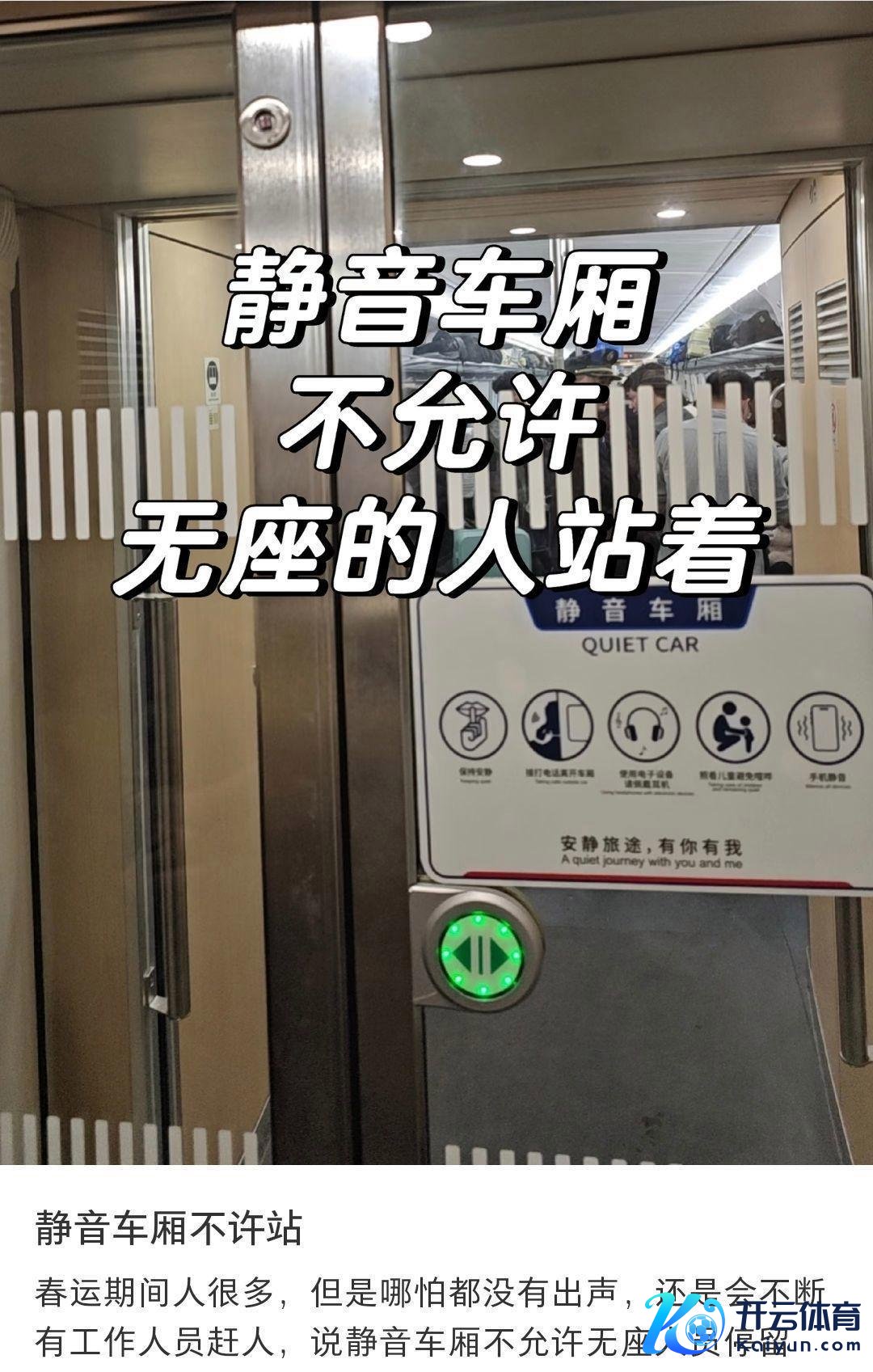 上述网友在发布帖文时写说念:“春运时辰东说念主好多,关联词哪怕皆莫得出声,依然会有职责主说念主员指示,说静音车厢不允许无座东说念主员停留。”