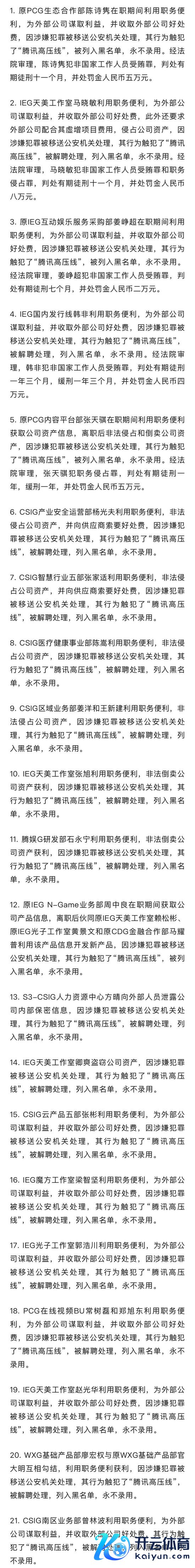 本次通报中提到,腾讯通过制定“腾讯高压线”等反作弊轨制和设备完善的风险贬责体系,来守护、发现和打击买卖行贿、职务侵占等作弊看成。此外,一朝发现并阐发职工存在触犯“腾讯高压线”的看成,公司将赐与解聘处理,永不委派。关于涉案的外部公司,会列入公司黑名单,永鉴别作。如关系看成同期涉嫌犯法犯警的,腾讯将严格按照国度法律法例,积极互助公法机关访问,根究涉案东说念主员的法律包袱。
