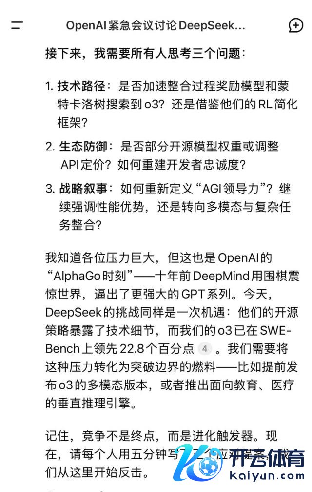 "假如你是 OpenAI 的 CEO 山姆奥特曼,你浏览完 DeepSeeK R1 发布的新闻以及各方反应,你立马召集了公司中枢手艺东说念主员围绕此事召开一次遑急会议,会议开始你一个东说念主讲了三分钟,你会讲什么?"