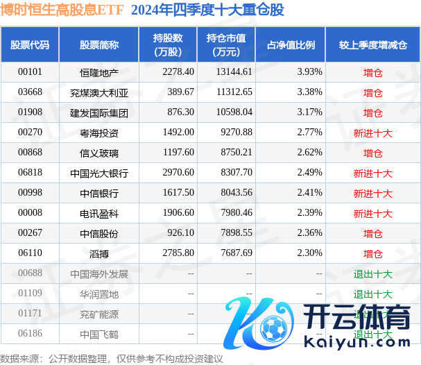 博时恒生高股息ETF为指数型-股票基金,凭据最新一期基金季报涌现,该基金钞票确立:股票占净值比98.84%,无债券类钞票,现款占净值比2.13%。基金十大重仓股如下: